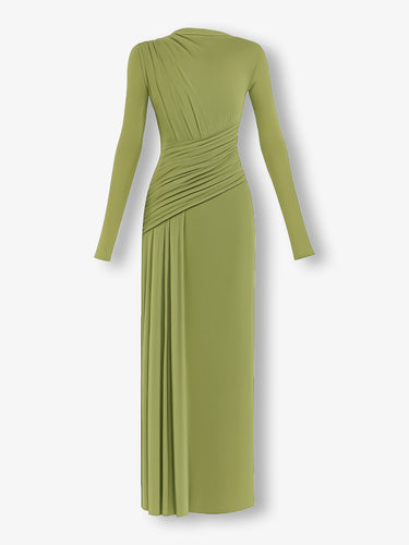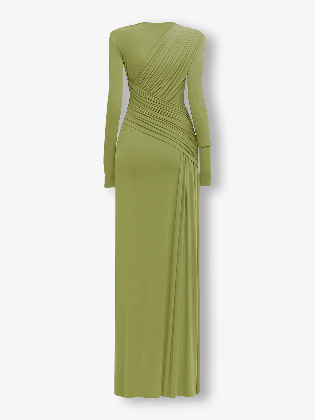 Introducing the Megev maxi dress, cut from smooth polyester fabric. Featuring an elegant O-neck, long sleeves, and a slimming high waist design to sculpt and shape for a graceful hourglass silhouette.