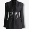 Introducing the downtown blazer, cut from premium crepe fabric. Featuring a mesh corset detailing and clasp closure, this blazer is designed to accentuate the waist and create an hourglass shape.