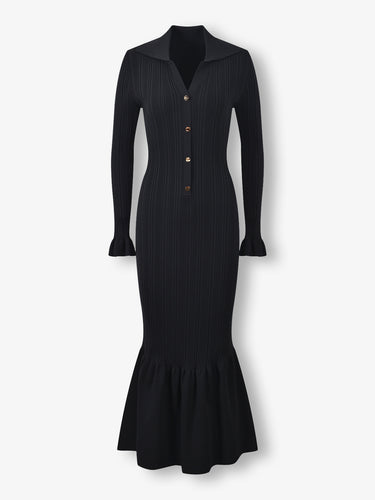 Introducing the Milan maxi dress, cut from luxurious polyester-spandex fabric. Featuring a lady-elegant French style with a solid turn-down collar, long sleeves, and a flared hem to sculpt and shape for an elegant hourglass silhouette.